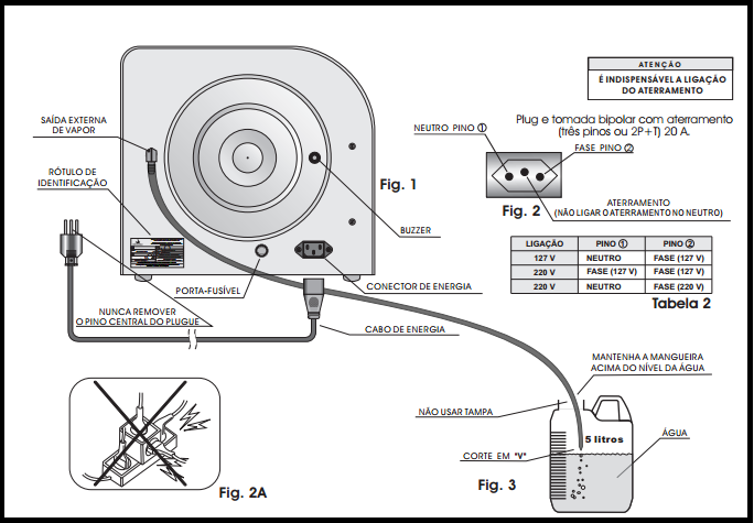 Verifique se a voltagem da autoclave coincide com a voltagem da rede elétrica do local de instalação. Para tanto, observe a voltagem indicada no rótulo metálico de identificação que se encontra na parte posterior do equipamento. Consulte “Como Identificar sua Autoclave” (Fig. 27, pág. 25). Na instalação utilize tomada de três pinos com aterramento (2P + T, 20A) conforme novo padrão brasileiro, NBR 14136:2002 (Fig. 2, pág. 8) ligando fase/neutro ou fase/fase nos pinos laterais e o aterramento no pino central:Nunca ligar o aterramento no neutro.