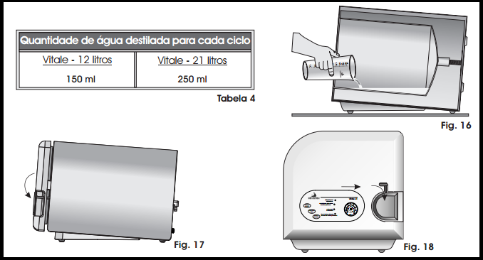Abra a porta da autoclave, usando o copo dosador, coloque a quantidade correta de água destilada diretamente na câmara antes de cada ciclo (Figura 16) de acordo com a tabela abaixo;