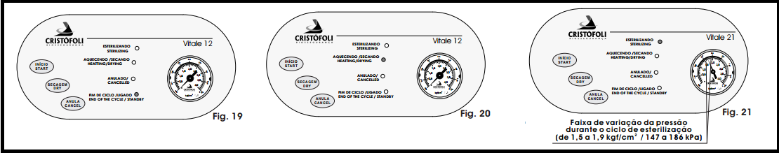 Quedas de energia ou oscilações na voltagem da rede elétrica também poderão causar a interrupção e cancelamento automático do ciclo, nesse caso, o led Fim de Ciclo/Ligado acenderá. Se o monômetro indicar a existência de pressão na câmara, pressione a tecla anula, nesse momento a autoclave despressurizará. Aguarde o final da despressurização e pressione anula mais uma vez para voltar à fase inicial. Se não houver pressão na câmara, abra a porta da autoclave e retire manualmente toda a água restante na câmara com o uso de um pano limpo e seco;