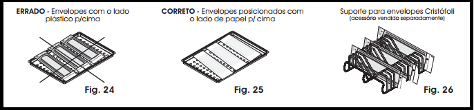 Observação: Ao utilizar os envelopes para esterilização, os mesmos devem ser acomodados nas bandejas da autoclave com o lado de papel para cima (Fig. 25), isso facilita a evaporação do vapor resultando em uma secagem rápida e eficiente. Conheça também o suporte para envelopes Cristófoli (Fig. 26) que, além de facilitar a secagem, otimiza a capacidade interna da autoclave podendo comportar até 13 pacotes (1 suporte, Vitale 12) e até 26 pacotes (2 suportes, Vitale 21). Nunca sobrepor os pacotes.
