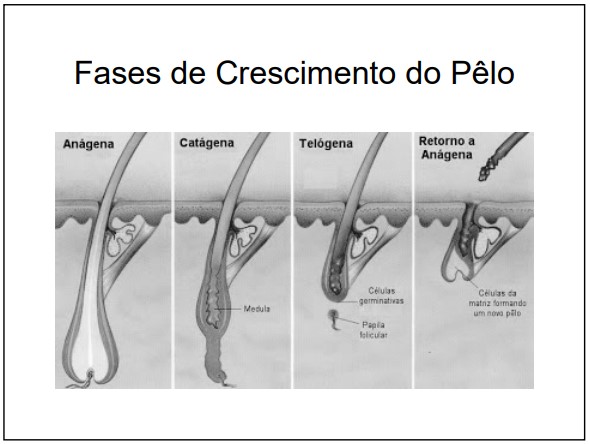 - Dura de 3 a 4 meses e é representada por 4 a 14% dos pêlos normais. Após o período de repouso, um novo pêlo emerge em substituição ao anterior (reinício da fase anágena)