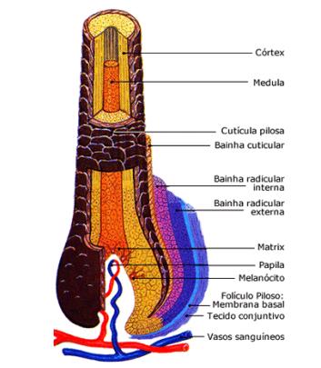 A cor do cabelo é resultado de outra proteína, chamada melanina, produzida por células chamadas melanócitos, que se encontram junto da papila, a parte onde se dá a reprodução celular. A Haste Capilar é formada por uma parte central, chamada de Medula, que é repleta de componentes porosos.