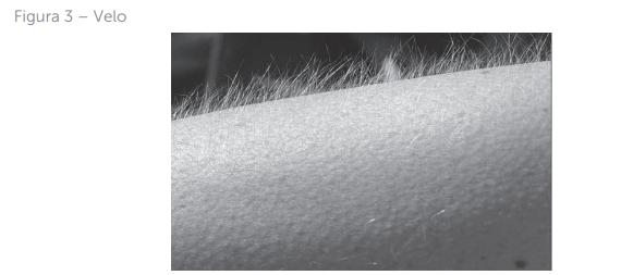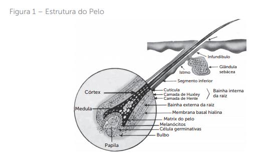 Os pelos são constituídos por uma parte livre – a haste − e uma porção intradérmica – a raiz. O pelo é contínuo com a epiderme, faz parte do aparelho pilossebáceo, é ricamente inervado e altamente vascularizado (KEDE; SABATOVICH, 2009).