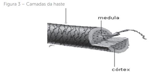 Cutícula: é a camada mais externa do fi o; formada por células sobrepostas transparentes tipo escamas, unidas por um cimento intercelular rico em lipídios. A cutícula protege o córtex e a medula. A cutícula é responsável por todos os efeitos sensoriais do cabelo, como brilho, suavidade e maciez. Age como uma barreira para produtos químicos, como coloração para cabelo, loções relaxantes e permanentes. Essa barreira não é impenetrável. Um pH alto e temperatura alta podem abrir a cutícula e deixar que produtos químicos penetrem no córtex. Já que a camada de cutícula é transparente, é o pigmento no córtex que determina a cor natural do cabelo (HALAL, 2012).