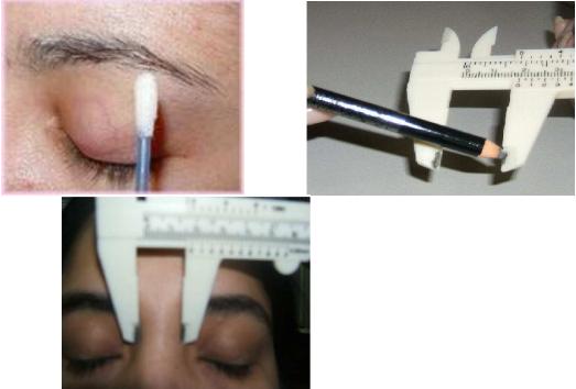No ponto central, coloque o paquímetro e marque onde começa a curvatura. Para marcar a espessura das sobrancelhas, atente-se para o fato: se os olhos estiverem abertos a medida será de 2 cm; Fechados de 2,5 cm.