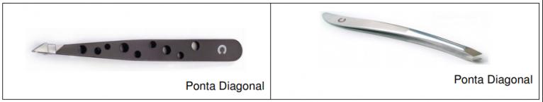 Ponta Diagonal :Uma pinça multiuso que oferece mais firmeza e precisão que a pinça de ponta fina. Quando adquirir uma pinça desse modelo verifique que ela não possui corte.