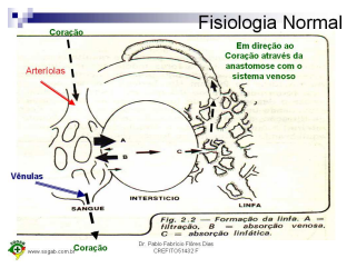 A este processo chamamos de filtração arterial. Já nas vênulas, a pressão oncótica é maior, fazendo com que o líquido que banha as células (meio intersticial) retorne para o sistema venoso; processo denominado absorção venosa. Em geral, a filtração ocorre em maior quantidade em relação a absorção venosa, fazendo com que “sobre” líquido no meio intersticial. Denominamos isso de “quase equilíbrio de Starling”, pois nem todo liquido que extravasa do sistema arterial (arteríolas) para os tecidos (interstício) é absorvido pelo sistema venoso (vênulas) gerando o líquido intersticial e portanto a linfa. Este desequilíbrio é revertido pelo sistema linfático, que auxilia na absorção venosa, captando o excesso de líquidos gerado pelo desequilíbrio venoso/arterial, e conduzindo-o novamente ao sistema sanguíneo, desembocando nas veias cavas. Portanto, o sistema linfático é um auxiliar na absorção venosa.