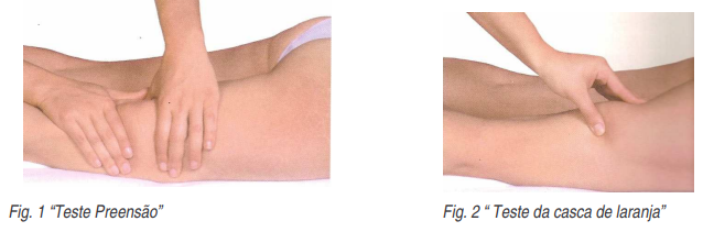 O primeiro teste é denominado “teste de preensão”, demonstrado na fig. 1. Após a preensão da pele juntamente com a tela subcutânea entre os dedos, promove-se um movimento de tração. Se a sensação dolorosa for mais incômoda do que o normal, este também é um sinal do fibro edema gelóide, onde já se encontra alteração de sensibilidade. O segundo teste, fig. 2, consiste no “teste da casca de laranja”, onde se pressiona o tecido adiposo entre indicador e o polegar ou entre as palmas das mãos, e a pele se parecerá com uma casca de laranja, com aparência rugosa.