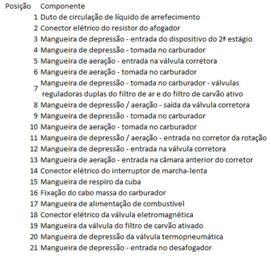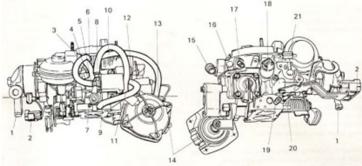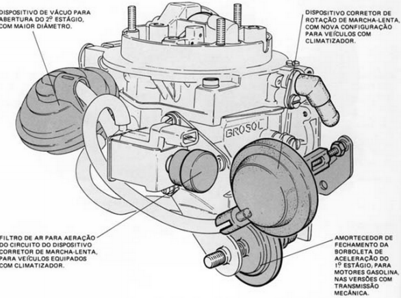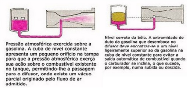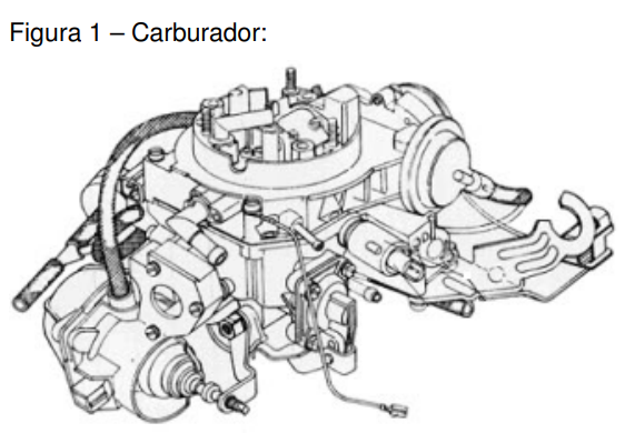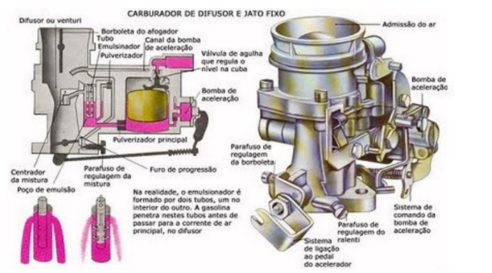 “O carburador é um componente mecânico responsável pela alimentação de um motor a combustão. Ele é responsável pela preparação da mistura ar/combustível em sua correta proporção para os motores de combustão interna, sendo seu funcionamento básico totalmente mecânico. O ar admitido pela depressão decorrente do movimento do pistão passa em alta velocidade pelo difusor (um estreitamento de passagem) arrastando uma porção de combustível de um reservatório denominado "Cuba". A borboleta (instalada na base do carburador) ligada diretamente ao pedal do acelerador controla de acordo com sua abertura a quantidade de mistura admitida pelo motor. O combustível é alimentado por uma bomba de funcionamento mecânico diretamente conectada do eixo do virabrequim. Na posição de marcha lenta a borboleta permanece fechada e toda mistura necessária para o funcionamento do motor é controlada por agulhas e giclês específicos para marcha lenta.