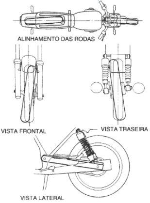 Se a roda traseira não estiver alinhada com a dianteira, verifique se os ajustadores da corrente de transmissão estão corretamente ajustados.Se a roda traseira estiver inclinada quando vista de cima, verifique se os braços do garfo traseiro estão desalinhados. Verifique também o alinhamento dos suportes dos amortecedores (modelos com dois amortecedores traseiros).
