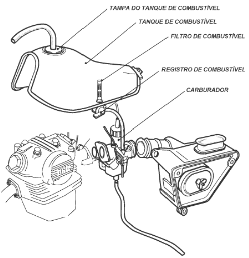 O filtro de combustível, filtra a gasolina para não permitir que partículas de sujeira cheguem ao carburador.A torneira de combustível é aberta e fechada quando necessário, ou também acessa o tanque reserva.A mangueira de combustível faz a gasolina chegar ao carburador.