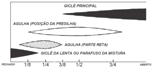 Na faixa de abertura média do acelerador (1/8 a 3/8 de abertura) o fluxo de combustível é controlado pela parte reta da agulha do giclê. Aumentando-se a abertura do acelerador (1/4 a 3/4), o fluxo passa a ser controlado pela agulha. Quando o acelerador está totalmente aberto (1/2 até abertura total) o fluxo de combustível é controlado pelo giclê principal.