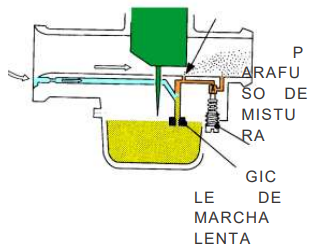 Marcha Lenta:o combustível passa através do giclê de marcha lenta e mistura-se com o ar proveniente do giclê de ar da marcha lenta. A quantidade de combustível utilizada na marcha lenta é controlado pelo parafuso de mistura.Na marcha lenta, o pistonete esta fechando a saída do bypass, impedindo o fluxo de combustível pela mesma. seja desalojada do seu assento pela vibração quando o veículo estiver em funcionamento, com isso, é garantida a estanqueidade do sistema. Serve também para proteger a ponta da agulha devido aos impactos provenientes do movimento da motocicleta.