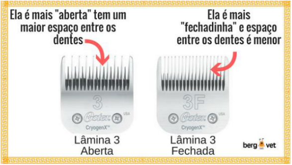 As Lâminas de T osa “Fechadas” como você puderam perceber possuem os dentes mais juntinhos e o espaço é bem menor entre o s dentes. As Lâminas “Fechadas” são m ais utilizadas que as “Abertas” pois permitem um corte mais preciso além de dar um excelente acabamento. As Lâminas “Fechadas” são mais seguras e dificilmente cortam o animal, por esse motivo são indicada s para iniciantes e proprietários de pet com pouca experiência em tosa. As Lâminas 10,15, 30, 4 0, 9, 8/5 e 5/8 Patinhas não possuem essa variação, são consideradas“Fechadas” as Lâminas: 3F, 4F, 5F, 6F e 7F.