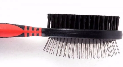 Escova:A escova de pino com bolinhas nas pontas é indicada para cães de pelagem lisa, pois ajudam no desembaraço, evitando que os pelos se quebrem. Sempre devemos ter cuidado com a formação de nós e com a força e a intensidade na hora da escovação; se exagerarmos na força, podemos machucar a pele dos cães.