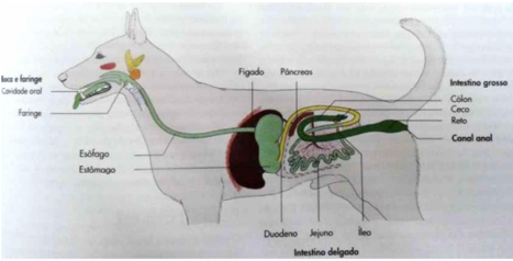 Segundo Mohrman (1979), o cão é um animal carnívoro por definição, mas onívoro por convenção, por isso é mais bem definido como sendo um carnívoro não estrito. O sistema digestório é constituído de um tubo que vai da boca ao ânus, sendo relativamente simples (Figura 1).
