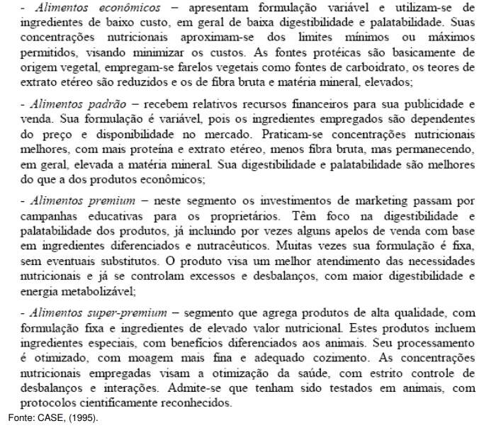 Entre os maiores produtores de alimentos para cães e gatos do mundo, o Brasil, apresenta grande competição entre as indústrias produtoras de rações. A relação indústria – consumidor é intensa, tanto para qualidade e preço como para interpretação visual e técnica destas dietas. Um dos pontos importantes desta relação é a classificação dos alimentos por qualidade. Dimensionada pela indústria, esta classificação se torna habitual no momento da compra e pelos consumidores. Esta classificação se resume por faixas ou segmentos: