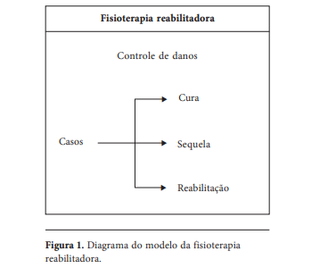 A Figura 1 apresenta uma representação esquemática da limitada área de atuação da fisioterapia reabilitadora. Pela sua própria concepção e sua conformação ao modelo assistencial curativo, a fisioterapia destinou-se, quase exclusivamente, ao controle dos danos de determinadas doenças. A atuação na fisioterapia reabilitadora é destinada à cura de determinadas enfermidades e/ou a reabilitação de sequelas e complicações. Seu objeto de intervenção é o sujeito individualizado, quando não, apenas partes ou órgãos isolados do corpo.