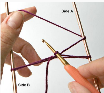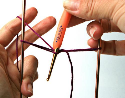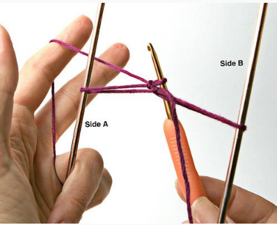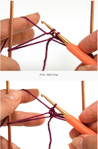 a- A linha deverá ser passada sobre a ponta da agulha, em seguida, através de uma laçada na sua agulha de ponto tunisiano.