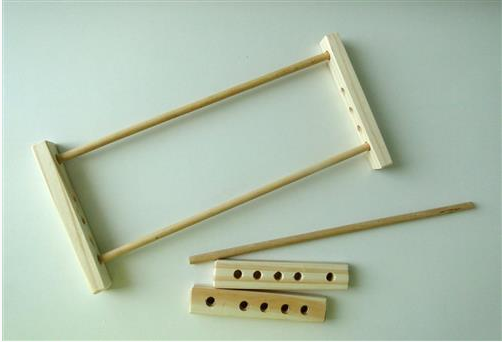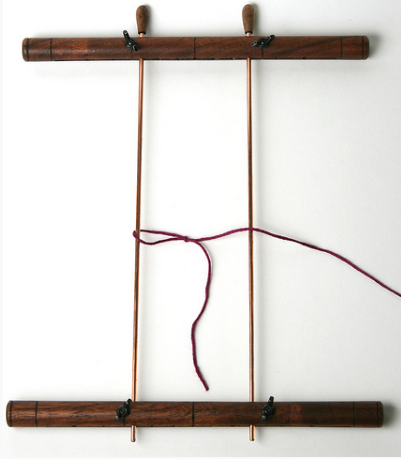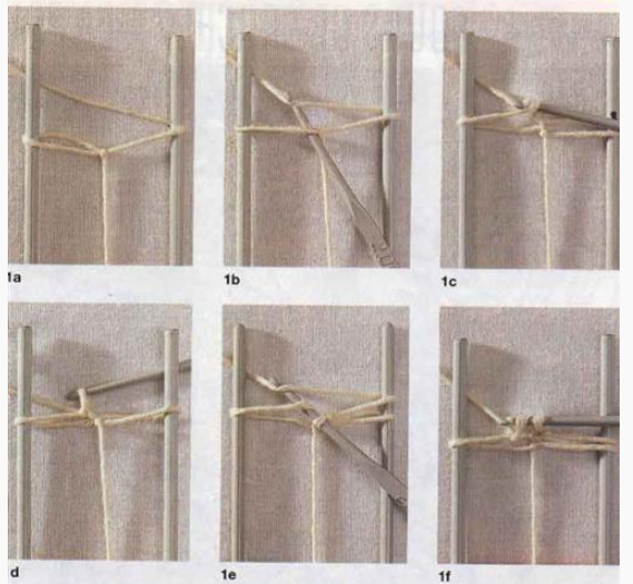 As configurações de largura dos teares de renda em espinha variam entre diversos fabricantes. Para começar, fixe o fio com um nó no meio das hastes.
