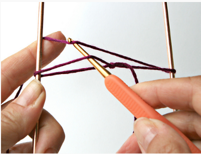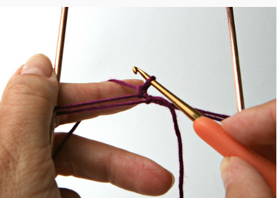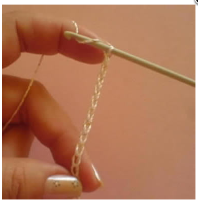 c- A agulha deverá ser inserida dentro da segunda corrente, conte a partir da agulha. Em seguida, a agulha deverá ser passada por cima da linha uma única vez, puxada e laçada para trás e voltando pela parte da frente do que está sendo feito.