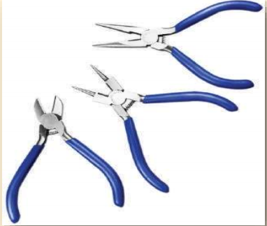 Para iniciar, três alicates são suficientes: um para corte, ponta redonda e de bico chato. À medida que for desenvolvendo suas peças poderá fazer uso de outros alicates disponíveis no mercado para acabamentos mais delicados ou específicos para determinada função.