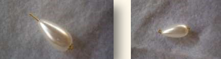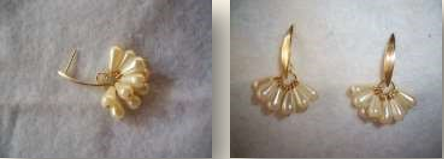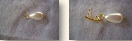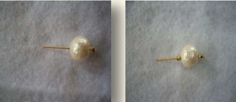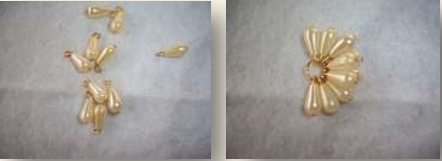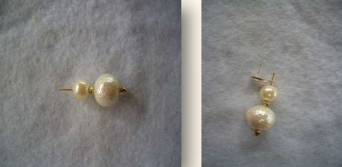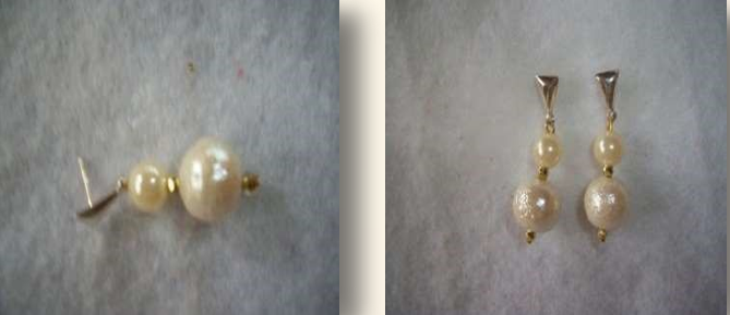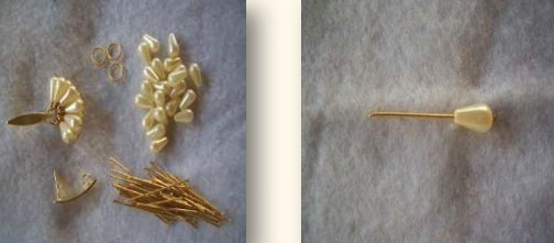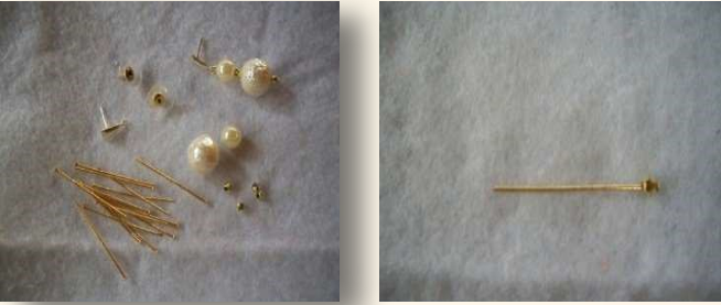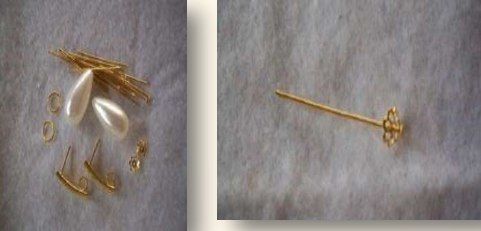 Material: quatro contas peroladas redondas, duas maiores e duas menores; quatro contas douradas pequenas; dois alfinetes de cabeça; duas bases para brincos; duas tarraxas.