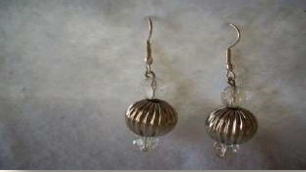 Material: Duas contas prateadas; quatro contas transparentes menores; dois alfinetes prateados; duas bases para brincos em formato de anzol.