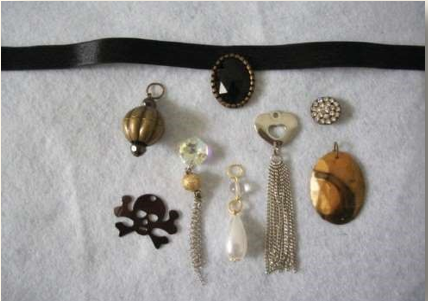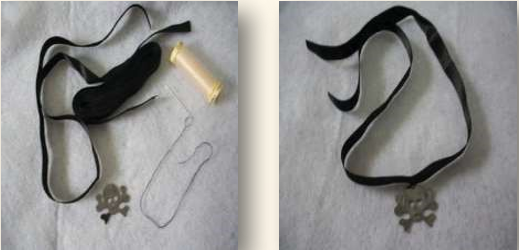 Material: fita preta de cetim; agulha; linha da cor da fita ou transparente e pingente. Neste caso, a caveirinha foi costurada na fita, mas dependendo do enfeite escolhido, pode ser colado na fita, usando cola para tecido, ou de bijuteria.