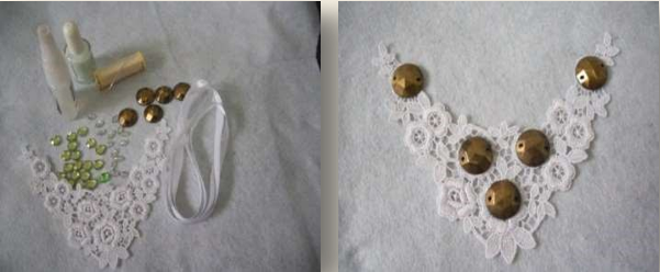 Material: renda de algodão; fita de cetim nº 02; cola; chatons grandes na cor cobre; chatons verdes e chatons transparentes em formato oval. Abra a renda sobre uma superfície lisa, passe cola e distribua os chatons maiores.