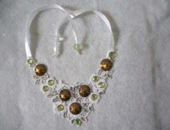 A quantidade de cola não precisa ser generosa, basta que tenha boa aderência. Na sequência, distribua os chatons verdes de forma harmônica. Sobre as folhas da renda, coloque os chatons em formato oval. Por último, cole ou costure a fita de cetim em cada lado da renda. Na ponta de cada fita, coloque uma conta de cristal, ou outra que melhor combinar, e dê um nó para arrematar. Espere a cola secar e está pronto um maxi colar.