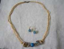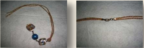 Material: cordão dourado; contas azuis; alfinete de argola; terminais; argola; tulipa; fecho.