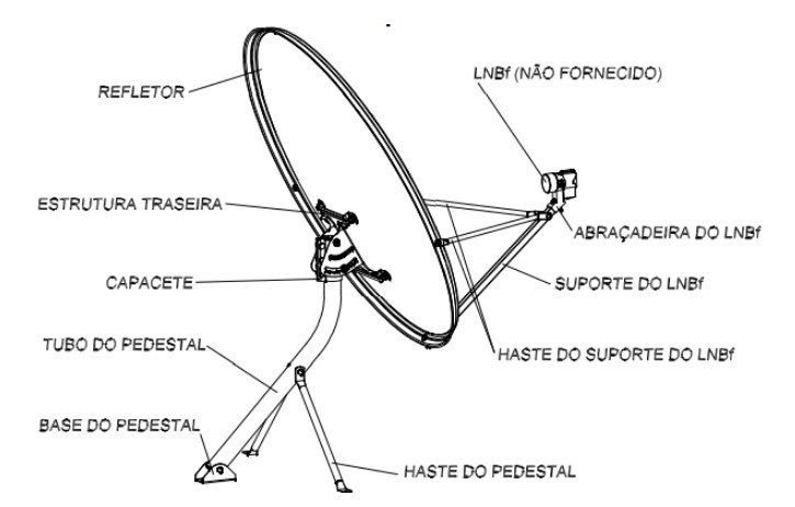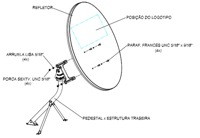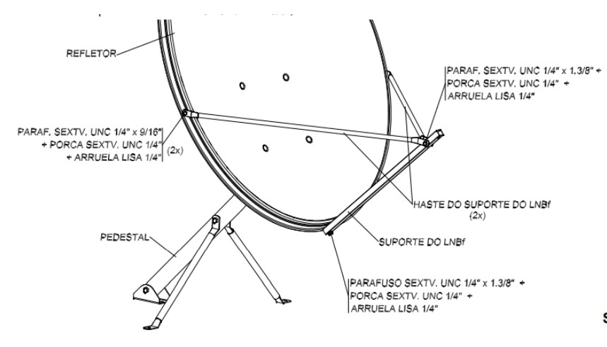 - Montar as hastes do suporte do LNBf, fixando no refletor as extremidades com ângulos menores utilizando parafusos sextavados UNC 1/4” x 9/16”. Fixar a outra extremidade no suporte do LNBf, utilizando o parafuso sextavado UNC 1/4” x 1.3/8”;