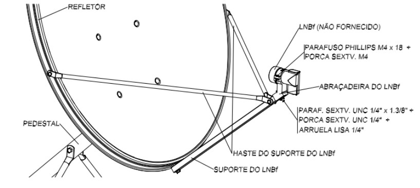 - Montar o suporte do LNBf na parte inferior do refletor, utilizando parafuso sextavado UNC 1/4” x 1.3/8” com uma arruela apoiada no tubo e a porca e a outra arruela, apoiadas na borda interna do refletor;
