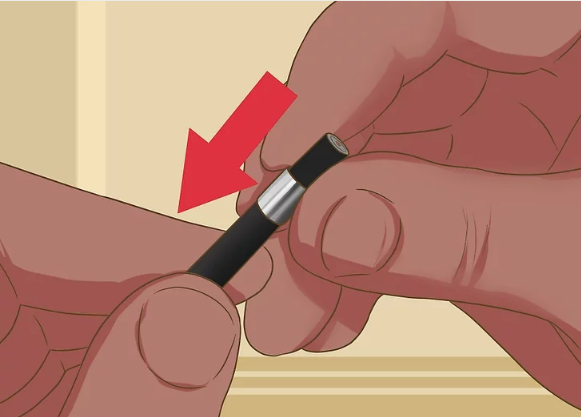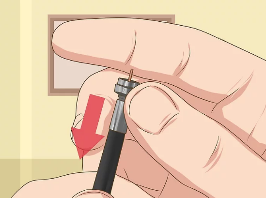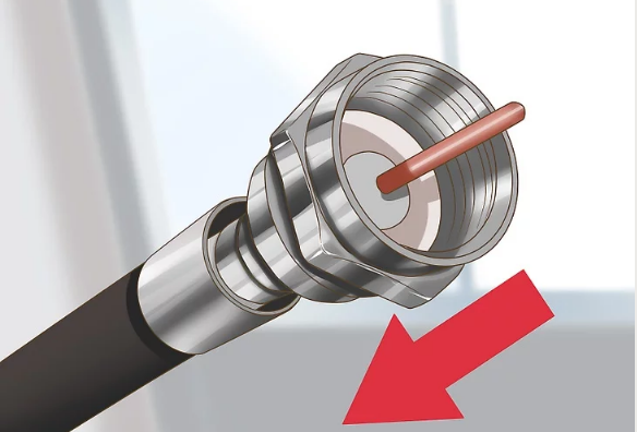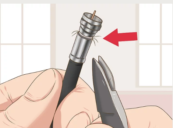 5.Empurre os conectores sobre a ponta do cabo para que o centro de cobre do cabo coaxial fique para fora.