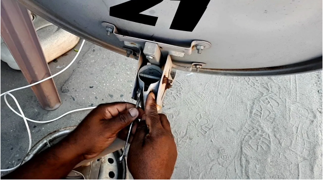 Com uma chave de boca 10 ou 11mm, afrouxe as porcas da parte traseira da antena o suficiente para conseguir o giro na horizontal e vertical.
