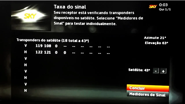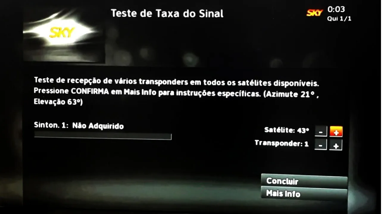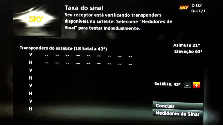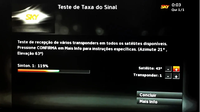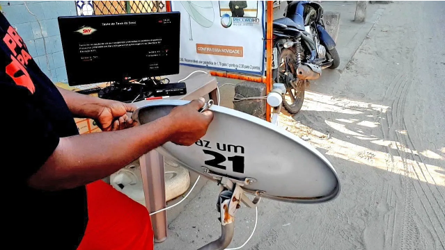 Para ter uma referência, observe ao redor se tem uma antena da Sky instalada e gire-a aproximadamente na posição das outras antenas. Com a tv ligada e olhando para o medidor de sinal, comece o apontamento.