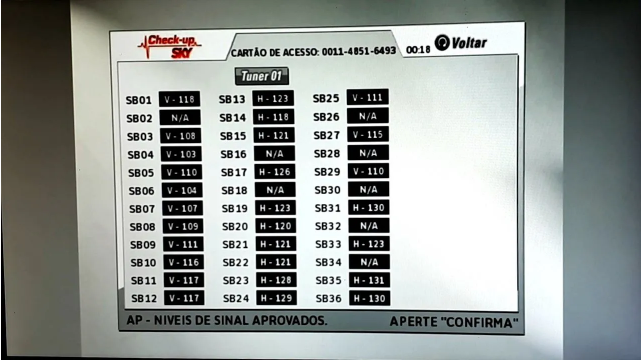 Continue pressionando a tecla 'Confirma" em Continuar até chegar na tela abaixo. Selecione a opção Medidores de Sinal
