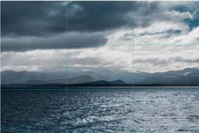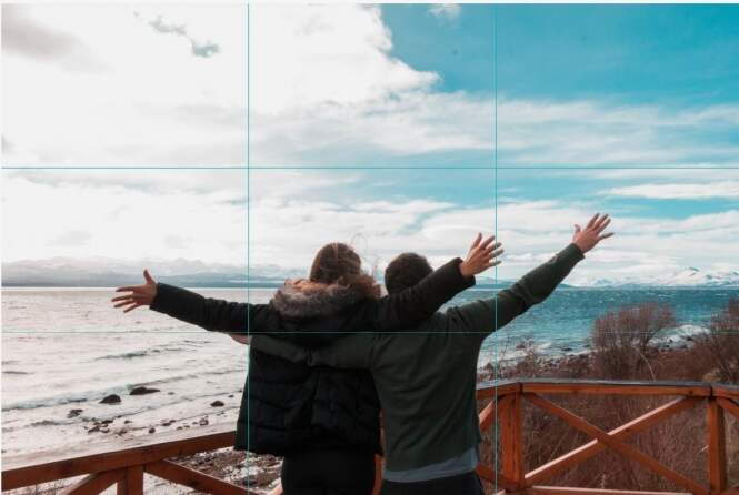 Quando for fotografar, imagine a cena dividida, como apresenta a imagem abaixo. Pense nos elementos mais importantes da fotografia e tente posicioná-los perto das linhas ou em suas intersecções. Eles não precisam estar perfeitamente posicionados, contanto que estejam próximos. Na imagem acima, temos o céu passando pela linha superior, o mar pela inferior, e o casal próximo a intersecção das linhas do centro. Esta técnica força você a pensar com maior cuidado na hora de fotografar, e te oferece a criar um hábito que te ajudará muito no enquadramento. Em fotografias de paisagens, é normal querer colocar o horizonte no centro da fotografia, mas isso fará uma fotografia dividida, não dando uma boa impressão. Ao invés disso, tente colocar a linha do horizonte ao longo da linha horizontal de baixo, ou bem próxima dela, conforme imagem abaixo.