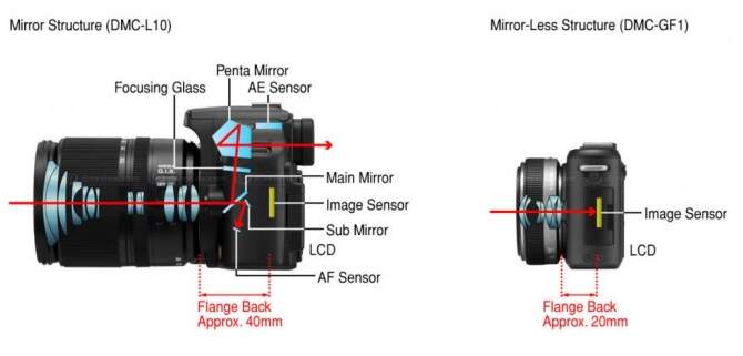 Para saber maiores informações sobre estas câmeras acima, entre outras, você pode acessar este link: http://www.techradar.com/news/photography-video-capture/cameras/best-dslrtop-cameras-by-price-and-brand-944543 Nestes links indicados nesta sessão, você poderá encontrar informações detalhadas, bem como preços, pontos fracos e pontos fortes de cada câmera. Em relação a diferença de engenhosidade entre as câmeras Mirrorless e DSLRs, segue abaixo um esquemático para você entender melhor: