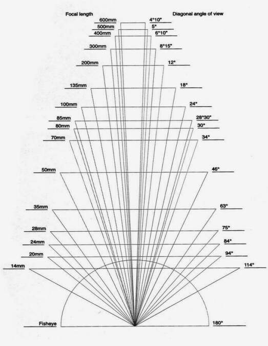 A distância focal nos diz respeito ao campo de visão adequado e enquadramento que desejamos alcançar. Podemos dizer que quanto menor a distância focal, maior o ângulo. Em termos práticos, a distância focal se refere ao alcance da lente e sua angulação. Para fotografias de arquitetura, por exemplo, precisamos de uma distância focal menor, para se obter um ângulo maior. A figura abaixo poderá lhe dar uma melhor visão das lentes com seus respectivos ângulos: