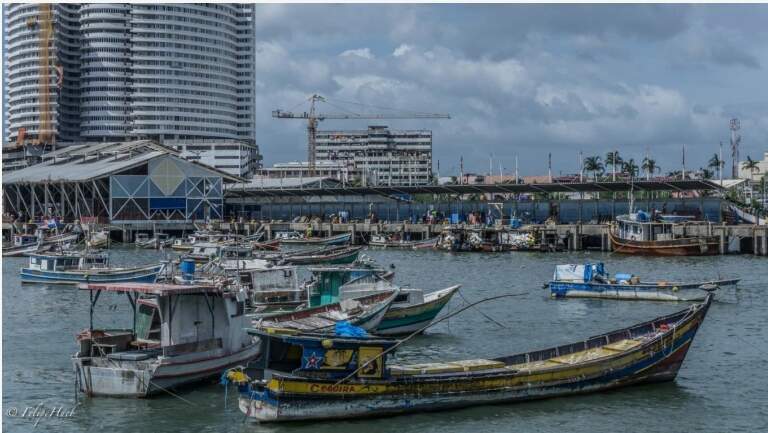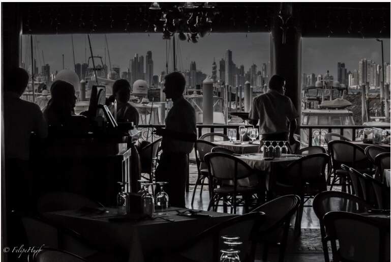 Estava dentro do restaurante, e queria destacar os belos edifícios da Cidade do Panamá ao fundo. Para isso, diminui a abertura para um maior campo de profundidade. O tempo estava nublado, escuro, e por dentro do restaurante havia pouca luz. Assim, para compensar a baixa abertura focal, aumentei o tempo de disparo o suficiente para não embaçar a foto. Como não deu para aumentar mais, elevei a sensibilidade do sensor para chegar ao nível de luz que gostaria.