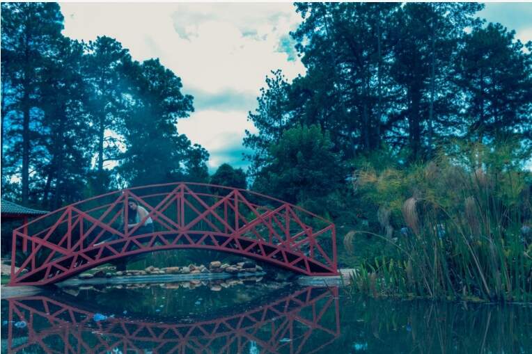 Nesta foto acima, temos uma grande abertura focal. A modelo permanece em primeiro plano, enquanto todo o fundo está em desfoque. Muita luz está entrando no sensor da câmera, diminuindo o campo de profundidade e destacando a modelo. Na fotografia abaixo, temos uma pequena abertura focal. A modelo em primeiro plano, o fundo totalmente nítido, mostrando os detalhes da floresta. Neste caso há pouca luz entrando no sensor da câmera, e o campo de profundidade é bem elevado.