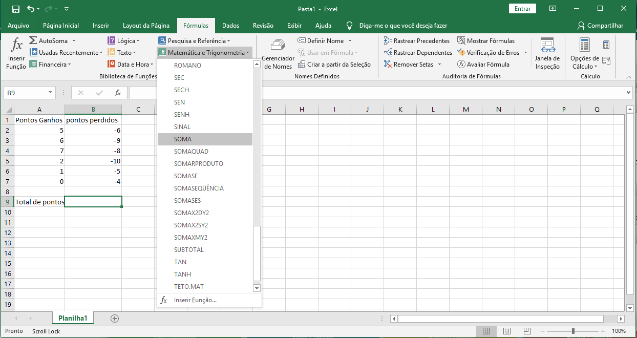 1 - Após montar a planilha, clique na célula onde o resultado será contado; clique em Matemática e trigonometria na caixa Biblioteca e selecione a opção SOMA localizada abaixo da lista.