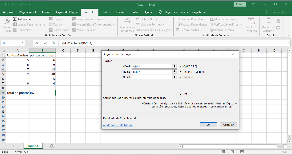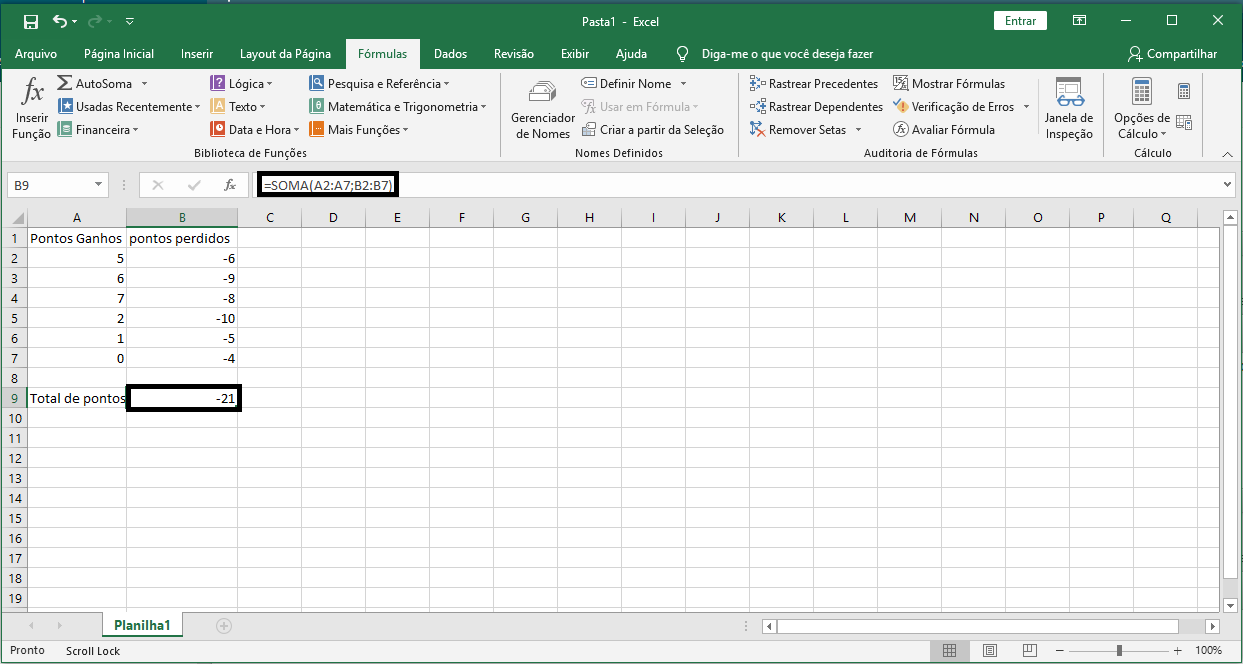 Por exemplo, temos uma planilha que contém duas proporções numéricas, uma com os pontos ganhos em um jogo e a outra com os pontos perdidos nesse jogo. Você quer saber quantos pontos restam no final do jogo, ou seja, adicione todos os valores na coluna A aos de B e, para isso, proceda da seguinte forma: