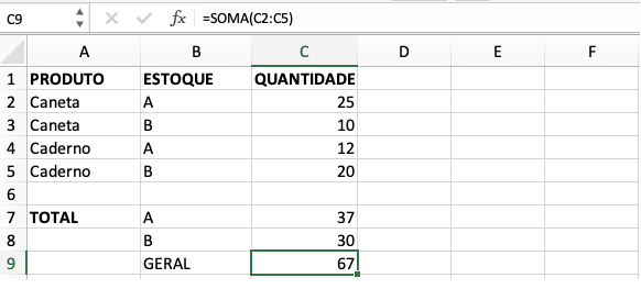 - =SOMA(C2;C4), trouxe os resultados do estoque A. Também poderia ser resolvido pelo simples comando “=C2+C4”