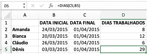 Lembre-se é preciso informar primeiro a data inicial e depois a final, ao contrário da =DIAS.