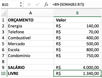 - Com a aplicação SOMA, é possível economizar tempo ao ter que escrever todas as células do intervalo. Sendo “=B9-(SOMA(B2:B7))”.