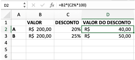 No exemplo A, a fórmula “=B2*(C2%*100)” inserida na célula D2 retorna o valor do desconto de 20% aplicado.