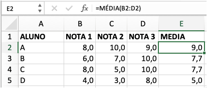 A média entre os valores pode ser representada pela função = MÉDIA. No exemplo abaixo, foi utilizado para calcular a média entre as três notas obtidas pelos alunos. Você só precisa relatar o intervalo de células entre parênteses na fórmula, assim: = MÉDIA (B2: D2). Se você não se lembra da função, o exemplo também pode ser resolvido com “= (B2 + C2 + D2) / 3”, em que 3 é o número de células adicionadas.